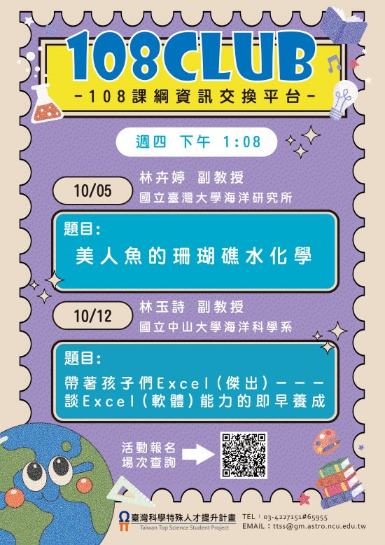 一、 | 108課綱之實行已有三年,有些課程改革可見成效,但尚存有很多挑戰需要克服,尤其是如何設計可以由學生親手動作和操作(hands-on)的實驗或資料分析任務。108俱樂部是一個虛擬中心,旨在建立一個可供各位老師分享相關教學經驗和心得的平台,也將邀請大學端的教授介紹他/她們的實驗及研究計畫,特別是中學教師所感興趣的資訊。本計畫於每月前兩周的星期四辦理。 |
