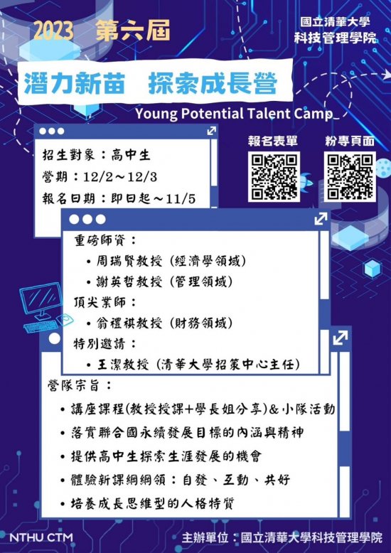 2) 國立清華大學科技管理學院將於112年12月2日~12月3日舉辦第六屆潛力新苗探索成長營海報.jpg