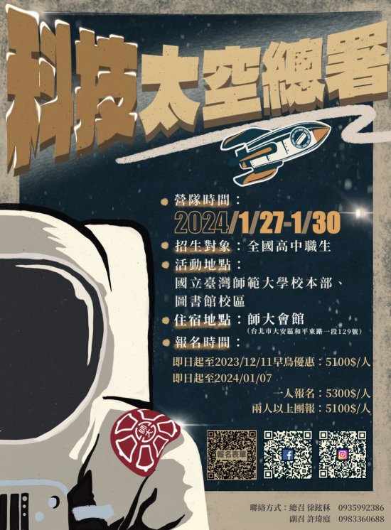 一、 | 本校科技應用與人力資源發展學系系學會為增進學生對於科技產品的瞭解,將於營期間教導木工製造、電子電路、雷射切割等基本操作辦法,謹訂於113年1月27日(星期六)至1月30日(星期二)、於本校校本部以及圖書館校區科技與工程學院舉辦第十屆臺師大科技營「2024臺師大科技營-科技太空總署」。 |
