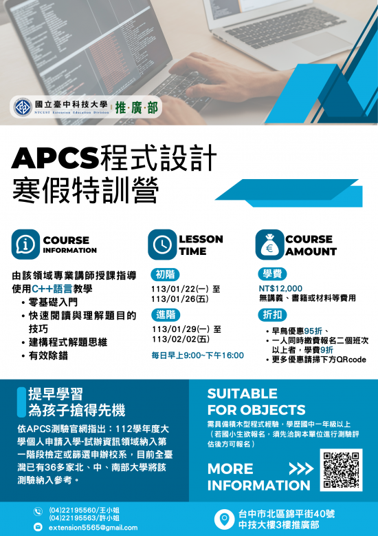 五、 | 更多課程資訊請參閱附件招生海報,或至本校推廣部網站查詢:https://extension.nutc.edu.tw/Course#1。 |