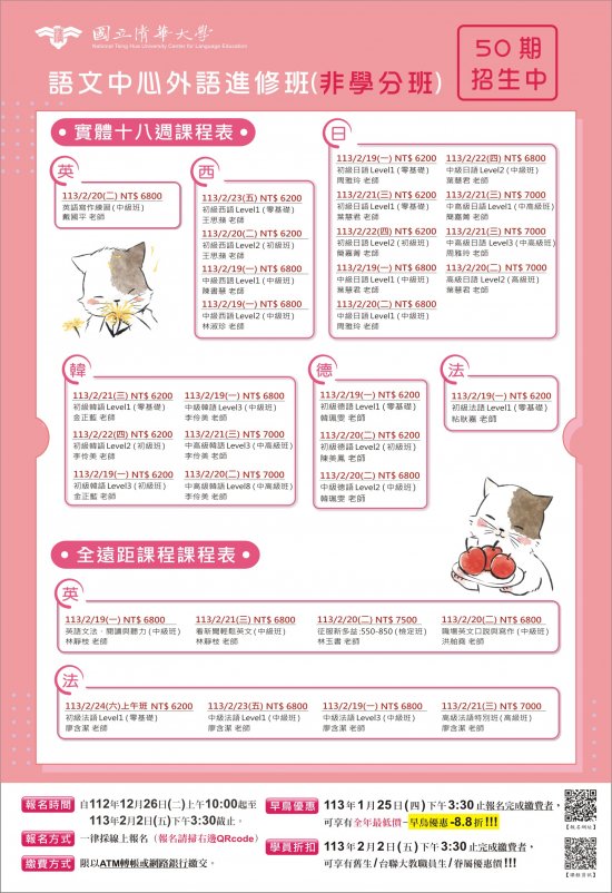 一、 為培育國際溝通力,辦理各類語文課程。50期外語推廣課程內容包涵英、日、韓、法、德、及西等六國語言,各類課程資訊請詳見:https://language.site.nthu.edu.tw/p/412-1212-21191.php?Lang=zh-tw