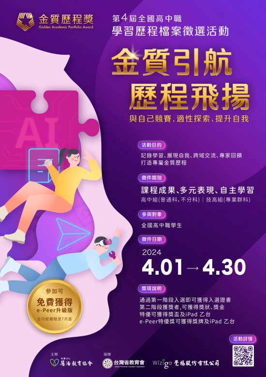 一、 社團法人慧治教育協會為了促進跨校交流,並提供學生展現自我的舞台,特舉辦全國高中職學習歷程檔案徵選活動【金質歷程獎】,鼓勵學生實踐所學,豐富學習歷程檔案,除了可獲得書審老師給予的實質回饋、了解學習歷程檔案製作的重點之外,獲獎學生也有機會受邀公開分享作品成果,培養邏輯思考及口語表達能力,奠定自主學習的基礎,是一個與自己的競賽,進而適性探索、提升自我的機會。歡迎貴校教師鼓勵學生參與,凡報名參加的學生皆能免費使用e-Peer共學平臺升級版記錄學習軌跡、彙整亮點成果,將學習經驗打造成金質歷程!