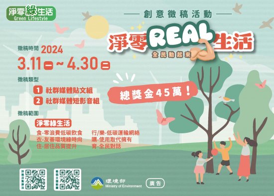 為鼓勵社會大眾了解淨零綠生活概念及激發創作靈感,環境部特辦理貼文及主題曲短影音徵稿活動,鼓勵各界報名參加。