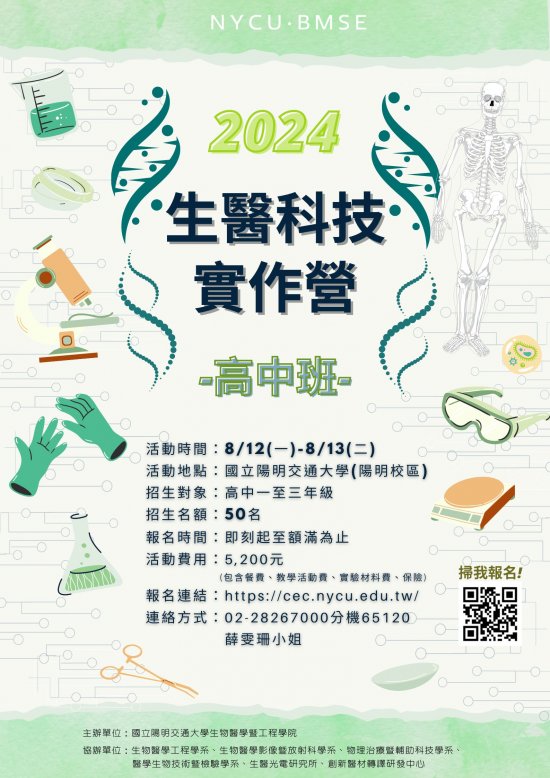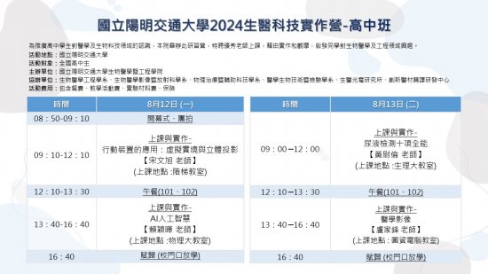 三、 | 檢附「2024生醫科技實作營」暑假梯次招生海報及課程規劃,敬請惠予公告宣傳,並鼓勵同學報名參加 |