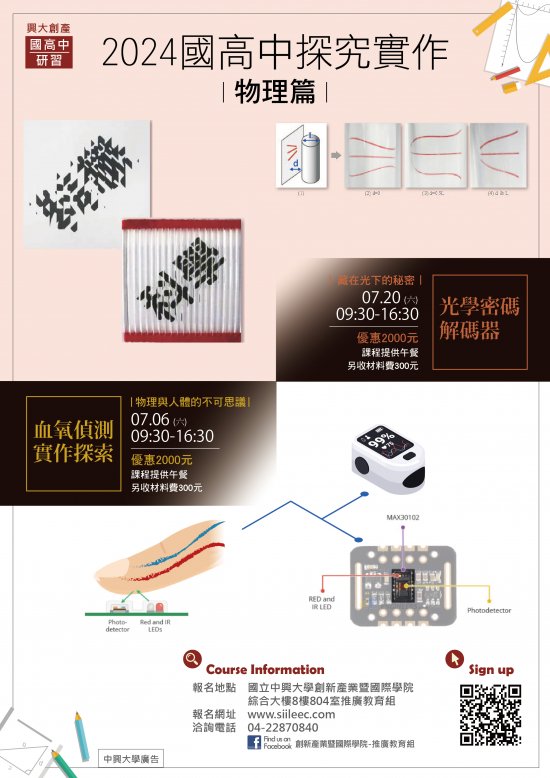 (二) | 物理學習全靠老師教學功力,想體驗物理實作真正有趣之處,歡迎參加《光學密碼解碼器-藏在光下的秘密》、《血氧偵測實作探索-物理與人體的不可思議》一日營隊,帶你發現內心的物理魂。 |