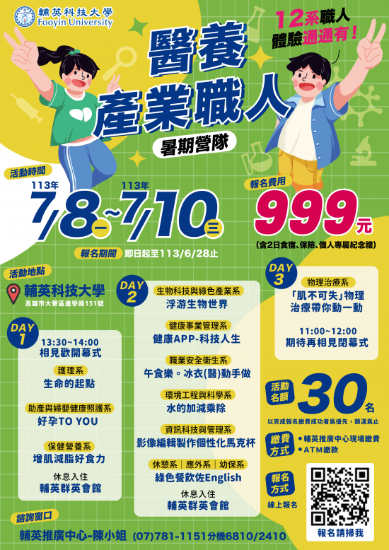 2、 | 網路報名:至輔英科大推廣教育中心網頁>夏令營隊-醫養產業職人>點選GOOGLE表單連結或掃描DM上QR-CODE填寫報名資料,並完成課程費用繳交即完成報名。 |