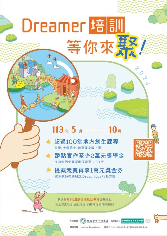 二、 | 前揭在地課程提供15至35歲青年,不限堂數免費參加;另18至35歲青年可進行蹲點實作,並提供至少新臺幣2萬元之獎學金(至少20天),歡迎鼓勵學生報名參與。 |