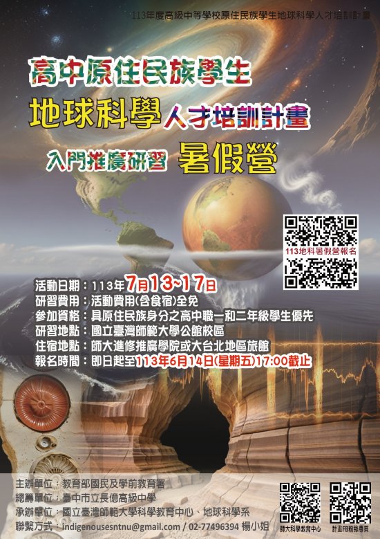 一、 | 為培訓具地球科學研究性向或興趣之高級中等教育階段原住民族學生,加強其科學基礎及實驗操作能力,以培育其成為原住民科學人才,以期未來回饋社會,協助推動原鄉科學教育。 |