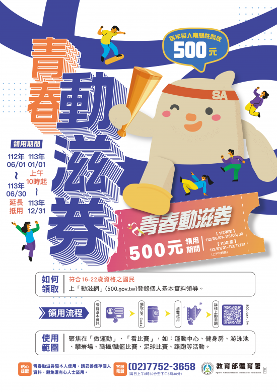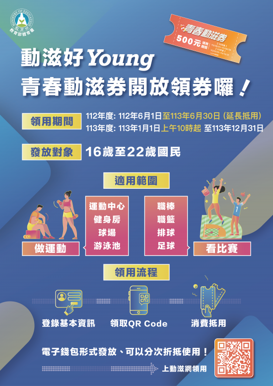 三、 112年度青春動滋券抵用期程至113年6月30日止,請惠予貴機關協助將青春動滋券海報電子檔公告於網站宣傳,鼓勵青年族群把握時間,使用青春動滋券參與體育活動或觀賞運動賽事。