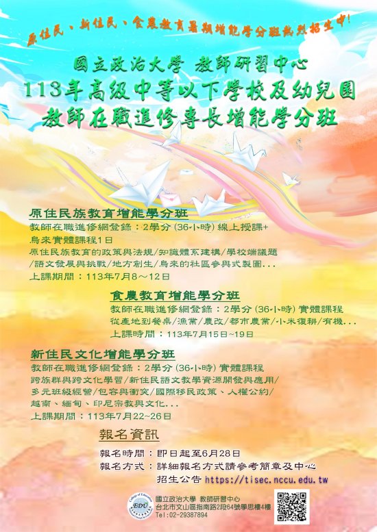 網路報名登錄至113年6月28日13:00止,請至中心網頁登錄報名 詳細資訊請參閱所附簡章內容或至教師研習中心網頁查詢。聯絡電話:(02)2938-7894。 |