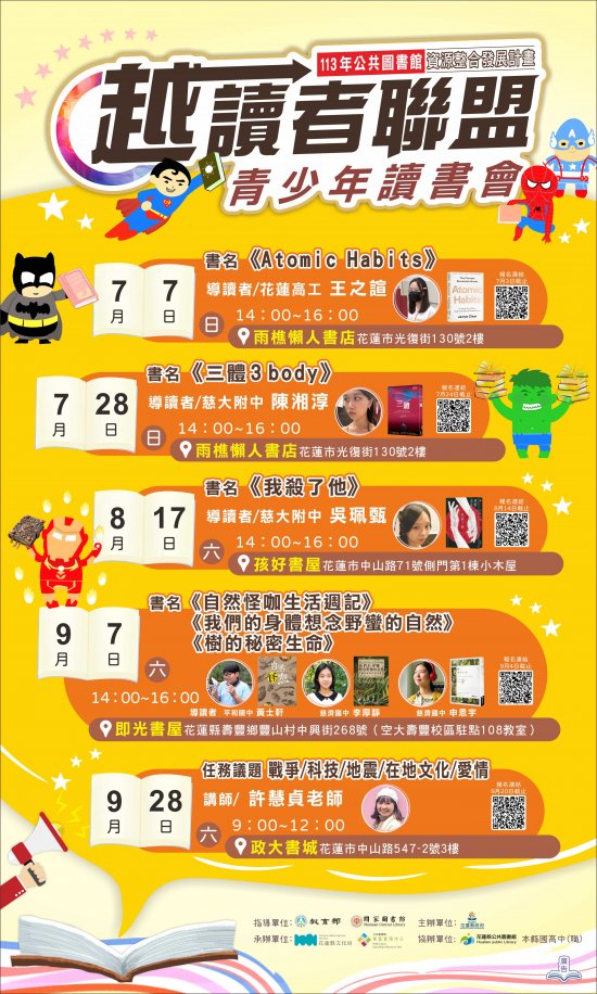 轉知花蓮縣文化局辦理「113年公共圖書館資源整合發展計畫-越讀 者聯盟-青少年讀書會」活動