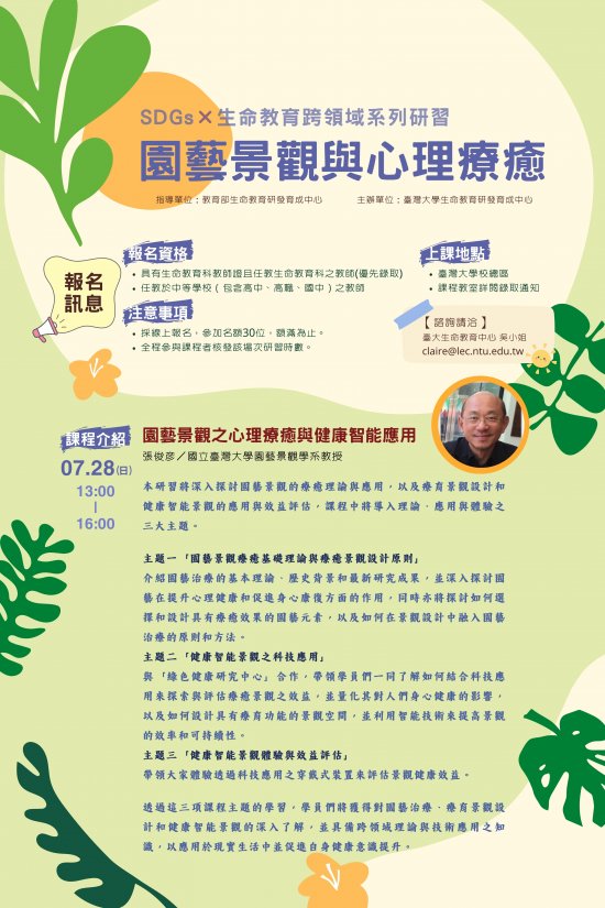 2、 7月28日:園藝景觀之心理療癒與健康智能景觀應用。