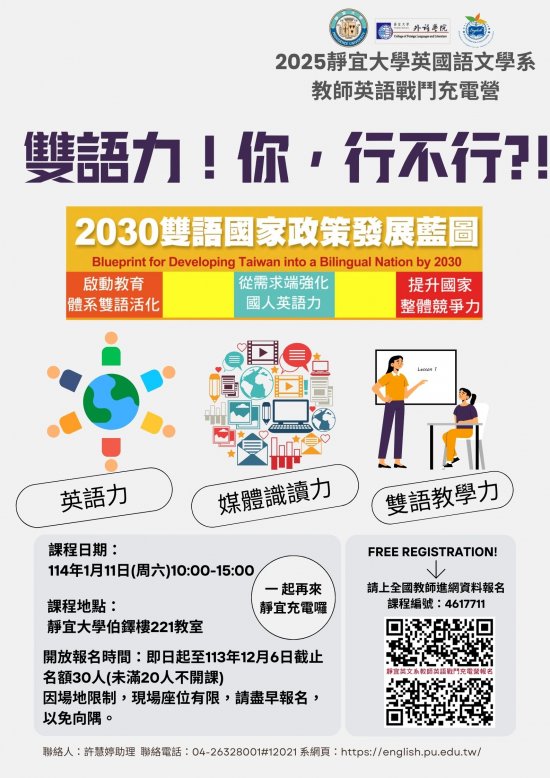 一、 2030台灣即將邁入雙語政策國家,為提升教學第一線老師英語能力與媒體識讀力,特舉辦本研習營。