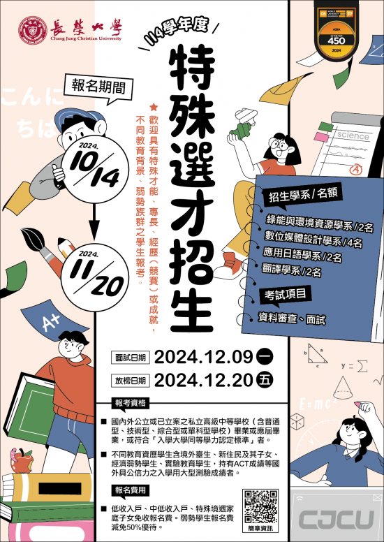 一、 | 本校114學年度學士班特殊選才招生簡章已開放考生上網查詢或下載列印,簡章下載網址:http://cjcu.tw/r/uVKcby。 |