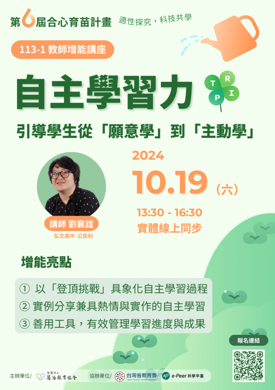 活動資訊:(一)主題:自主學習力:引導學生從「願意學」到「主動學」。(二)時間:113年10月19日(星期六)下午13時30分至16時30分。(三)活動形式:虛實整合,實體與線上同步進行。(四)參與對象:全台高中職教師。(五)研習時數:每場提供3小時的研習時數,如需研習時數可於回饋單留下身分證字號,以利後續作業。(六)報名方式:採線上報名,即日起至10/18中午12:00截止。