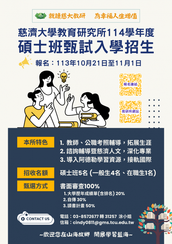 一、慈濟大學教育研究所以「教師、公職考照輔導,拓展生涯」、「諮詢輔導暨慈濟人文,深化專業」、「導入阿德勒學習資源,接軌國際」三大特色為宗旨。 二、報名資訊: