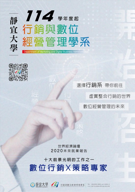 二、 | 依『2020世界經濟論壇未來就業報告』:『數位行銷與策略專家』是十大前景光明的工作之一,有鑑於此,本校企業管理學系為提升學生在就業市場的競爭力,自114學年度起更名為『行銷與數位經營管理學系』。 |