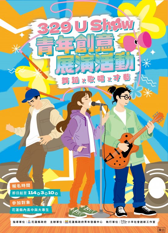 「329 U Show青年創意展演活動」招募簡章及海報各1份,鼓勵青年學子或相關社團等單位組隊報名參加。