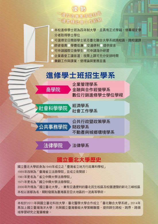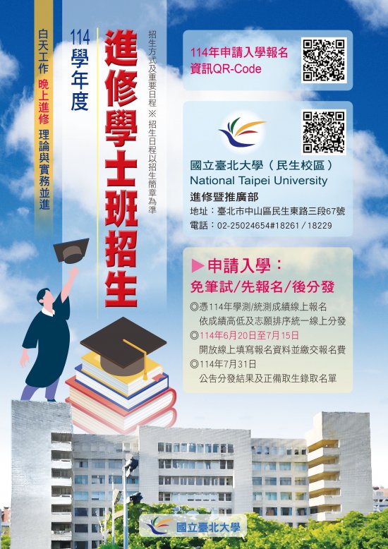 四、 | 本校今年網路報名相關資訊及連結請參閱:https://new.ntpu.edu.tw/eec/bachelor-continuing。 |