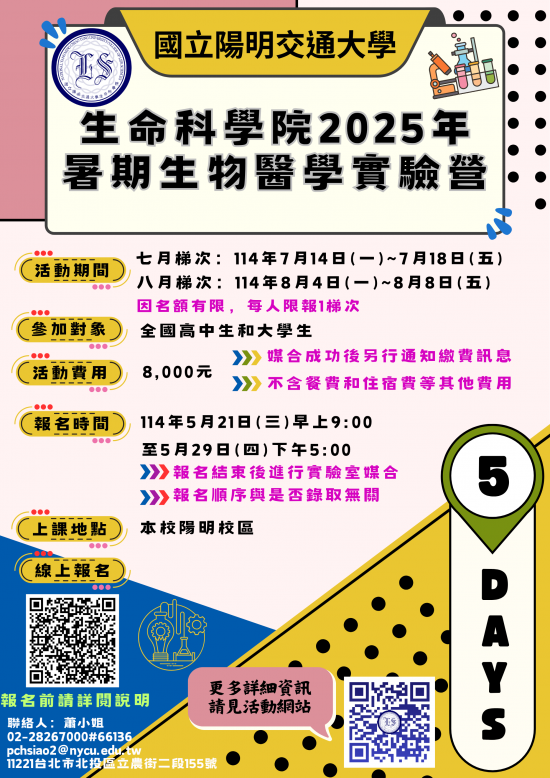 二、 | 「暑期生物醫學實驗營」共有兩梯次(七月梯次:114年7月14日(星期一)至7月18日(星期五);八月梯次:114年8月4日(星期一) 至8月8日(星期五),實驗室介紹及報名方式請至本校生命科學院網頁查詢(網址:https://cls.nycu.edu.tw)。 |