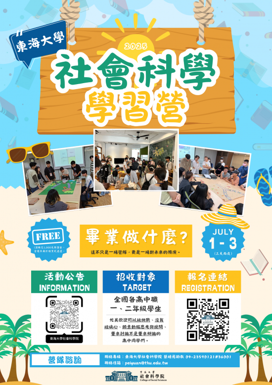 一、 | 本校社會科學院為推廣社會科學相關領域學科知識,訂於本(114)年7月1~3日(星期二~四)於本校社會科學院辦理「2025東海大學社會科學學習營~畢業做什麼?」營隊活動,營隊內容包含演講、遊戲活動、實地參訪、研究生經驗分享等,歡迎全國各高中職一、二年級同學報名參與。 |