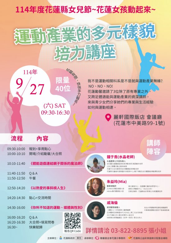 二、 為提升青少女將運動融入生涯與職涯規劃之認識與關注,該會將於114年9月27日舉辦「運動產業的多元樣貌培力講座」,並邀請水晶體律工作室負責人鐘于喬老師 、 ZUMBA台灣推廣大使朱益玲老師及資深體育記者戚海倫小姐擔任講師。