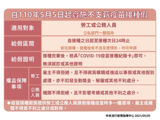疫情指揮中心已於110年5月5日宣布「疫苗接種(含接種後發生不良反應)假」(以下簡稱疫苗接種假),並自即日起實施,疫苗接種假相關事項如下: