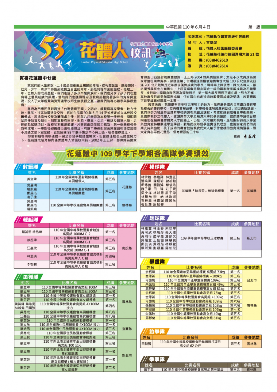 花蓮縣立體育高級中等學校全球資訊網電子報第 53 期